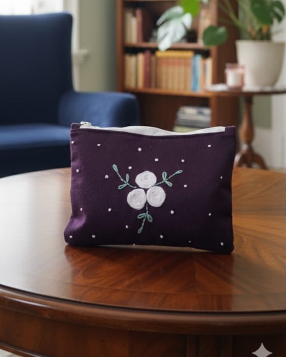 The Eco Charm Embroidered Cotton Hand Pouch is a beautifully handcrafted, eco-friendly pouch made from premium cotton fabric. Featuring delicate floral embroidery and a minimalist design, it is washable, reusable, and durable. Perfect for carrying cosmetics, daily essentials, or travel accessories, this pouch combines style with sustainability for everyday use.